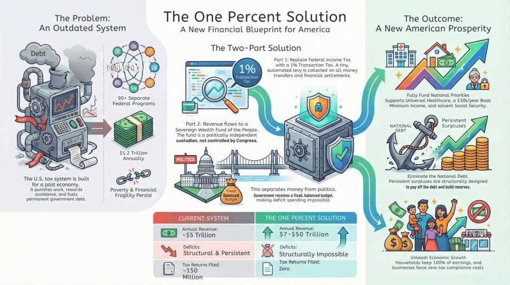 Crucially, The One Percent Solution pairs this tax with a structural safeguard: a constitutionally protected Sovereign Wealth Fund of the People that receives all transaction-tax revenue and distributes funds to government only within strict, balanced rules. The result is a permanently solvent public-finance system capable of funding healthcare, income security, retirement, education, defense, and rapid debt elimination—while restoring growth, transparency, and trust. This is not a new tax burden, but a system upgrade—one that asks the economy to work smarter, not harder.
